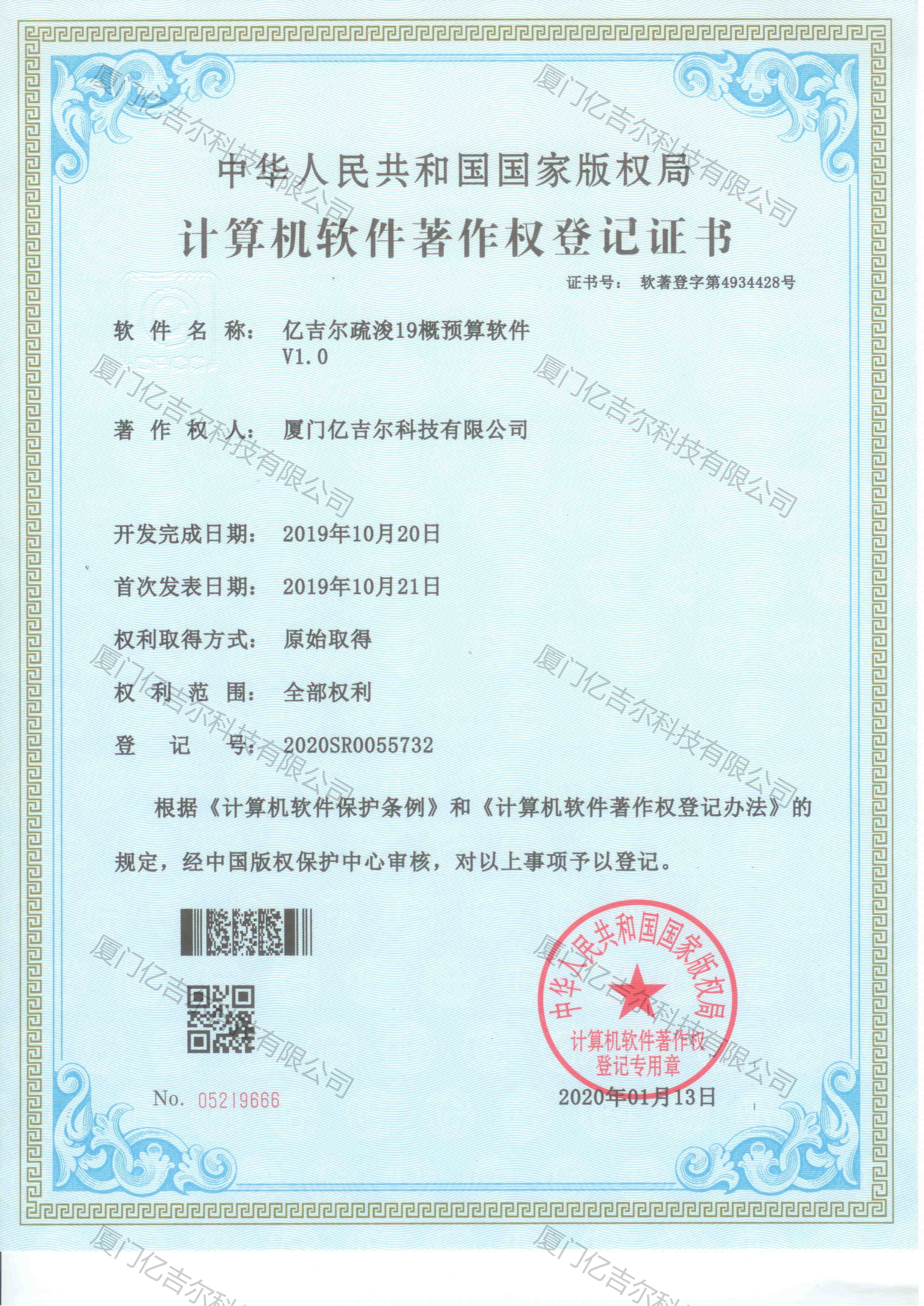億吉爾疏浚19概預算軟件著作權登記證書